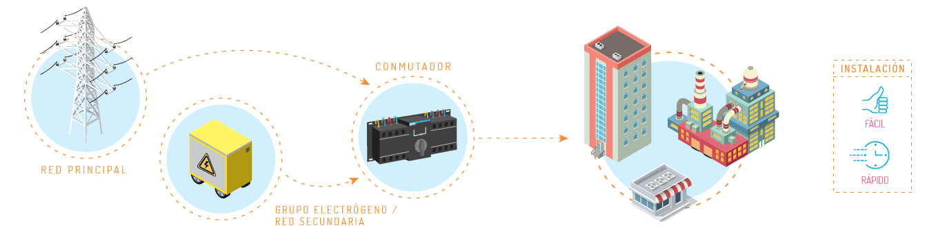 Los conmutadores pueden permutar automáticamente entre la fuente principal y una fuente secundaria en caso de fallos o fluctuaciones en la corriente, garantizando así la continuidad del suministro eléctrico.La necesidad de disponer de dos fuentes de suministro surge en situaciones donde el suministro eléctrico es crítico para el funcionamiento de equipos y sistemas. Algunos ejemplos son:Industria: en fábricas y plantas de producción, los conmutadores automáticos garantizan la continuidad del suministro eléctrico, evitando pérdidas de producción y posibles daños a los equipos por fluctuaciones en la corriente.