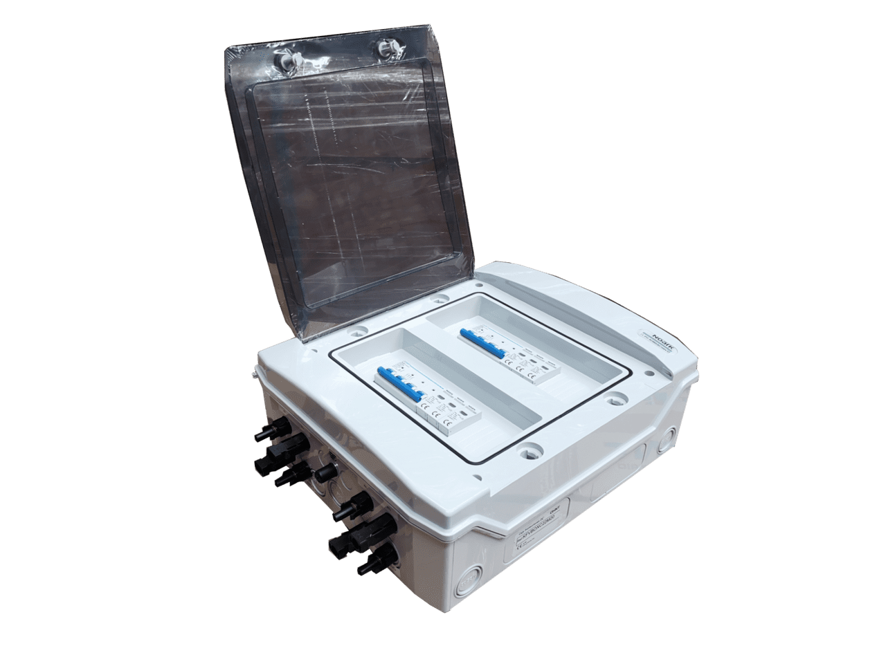 Cajas de protección de string para instalaciones fotovolticas completamente montadas – Conectores rápidos tipo MC4 – Protección magnetotérmica DC hasta 20A – Protección contra sobretensión transitoria: 600, 1200VDC Tensión de trabajo: 500, 1000VDC -Disponibles para protección de 1, 2 y 3 strings – Protección individual de cada string – Grado de protección IP 65